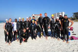 This morning, I met up with some folks I've been chatting with on iamtri.com for a practice swim in the Gulf. It was great to put faces with the names I've been seeing for a few months, and I feel a bit better about the open-water, saltwater swim now, too. The water was rougher today than it's been all week apparently, but I survived! Hopefully Saturday it'll be calmer, but I should be ready either way. Crazy cool how buoyant you are in saltwater with a wetsuit on!